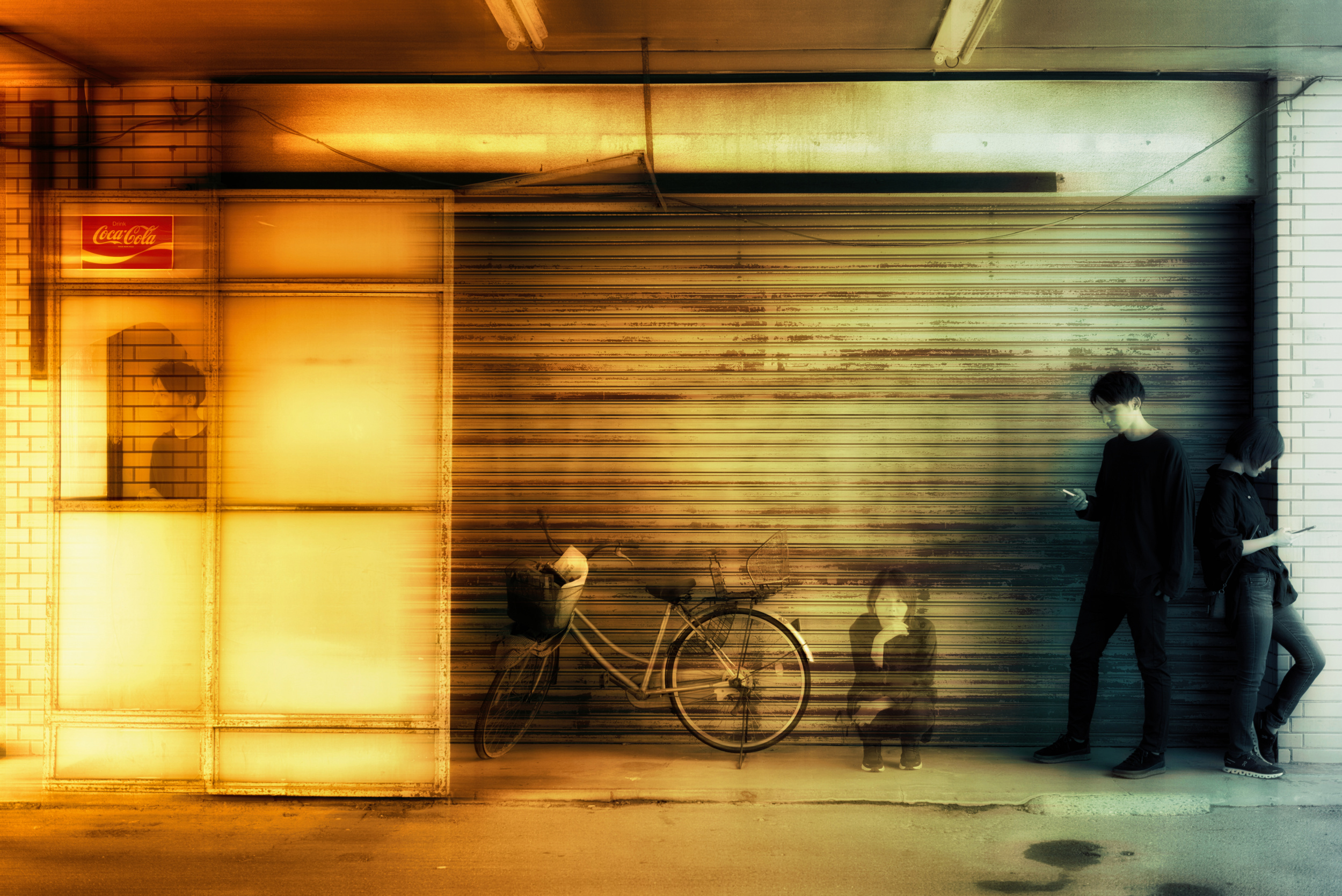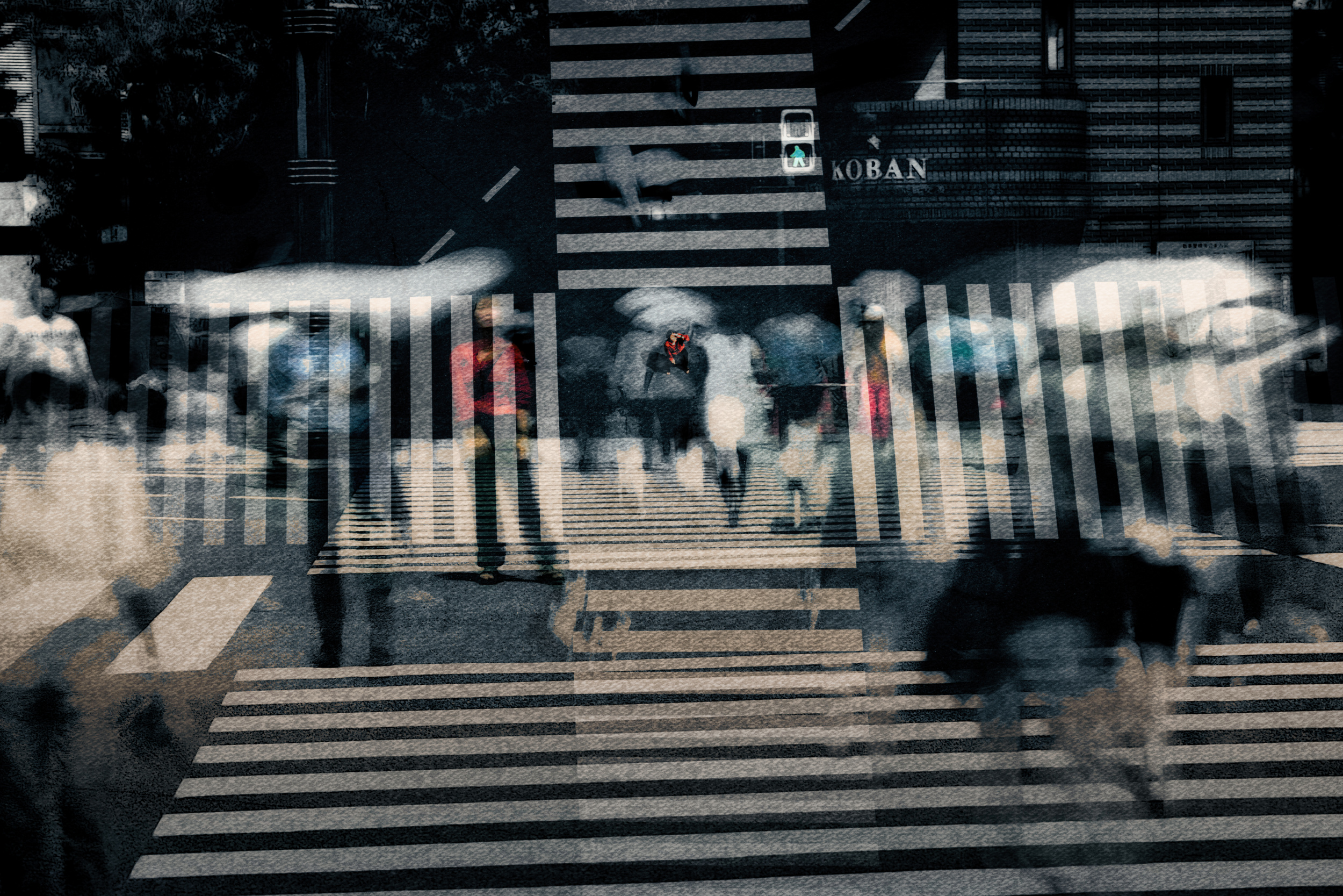 • The first photo combines slow-shutter shots of cars and people to express the speed of city life, and the loneliness felt within it.